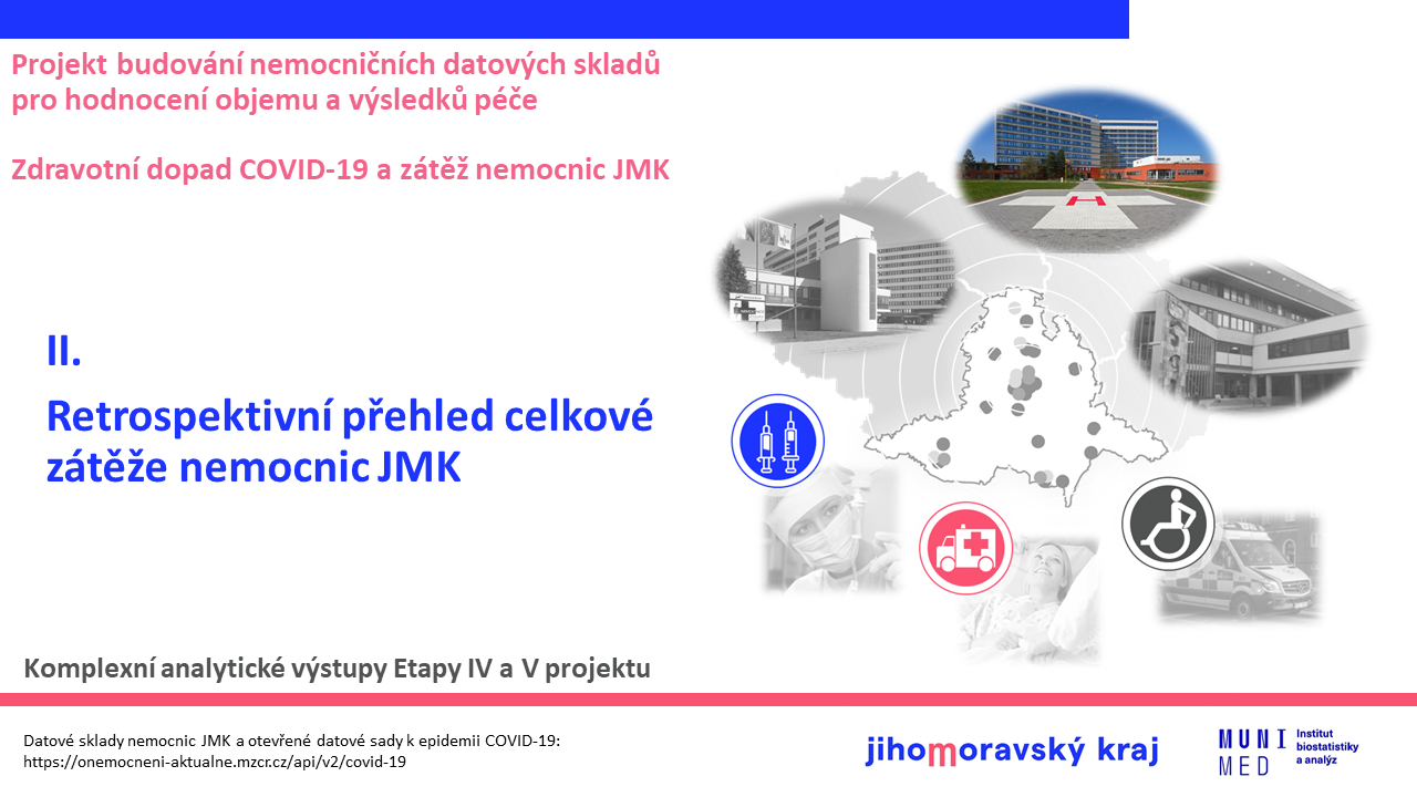 Z těchto důvodů bylo jako součást úvodních regionálních analýz provedeno mapování dopadů epidemie na různé segmenty péče v JMK (centrální publikovaná data) s důrazem na nemocniční péči (analýza validovaná obsahem nově vybudovaných datových skladů nemocnic).